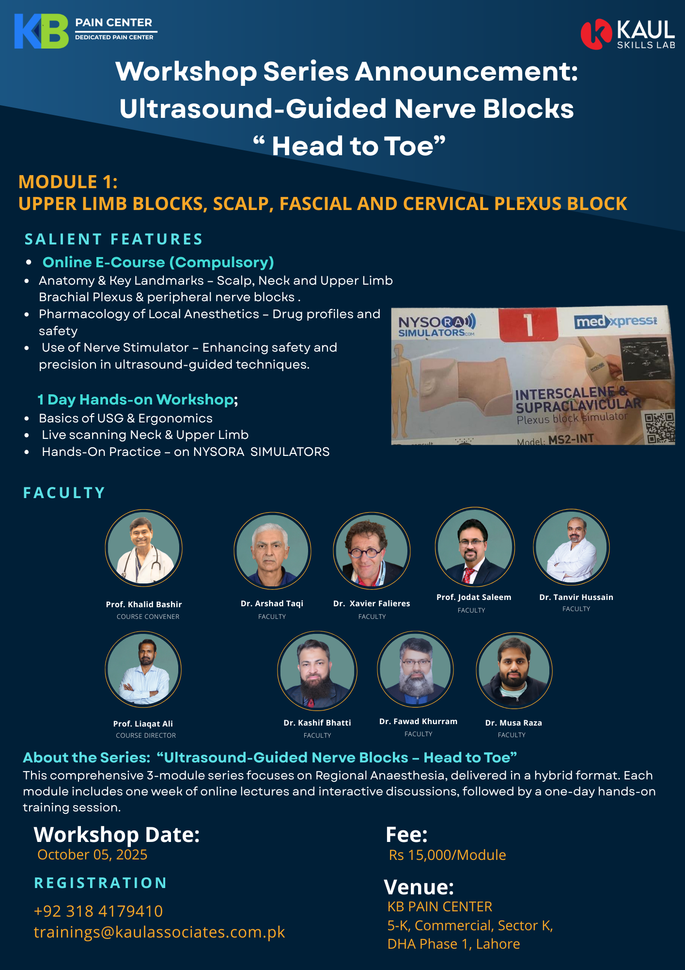 Anatomy, pharmacology, equipment, indications/contraindications, techniques overview; sonoanatomy, live scanning on NYSORA simulators, case discussions